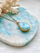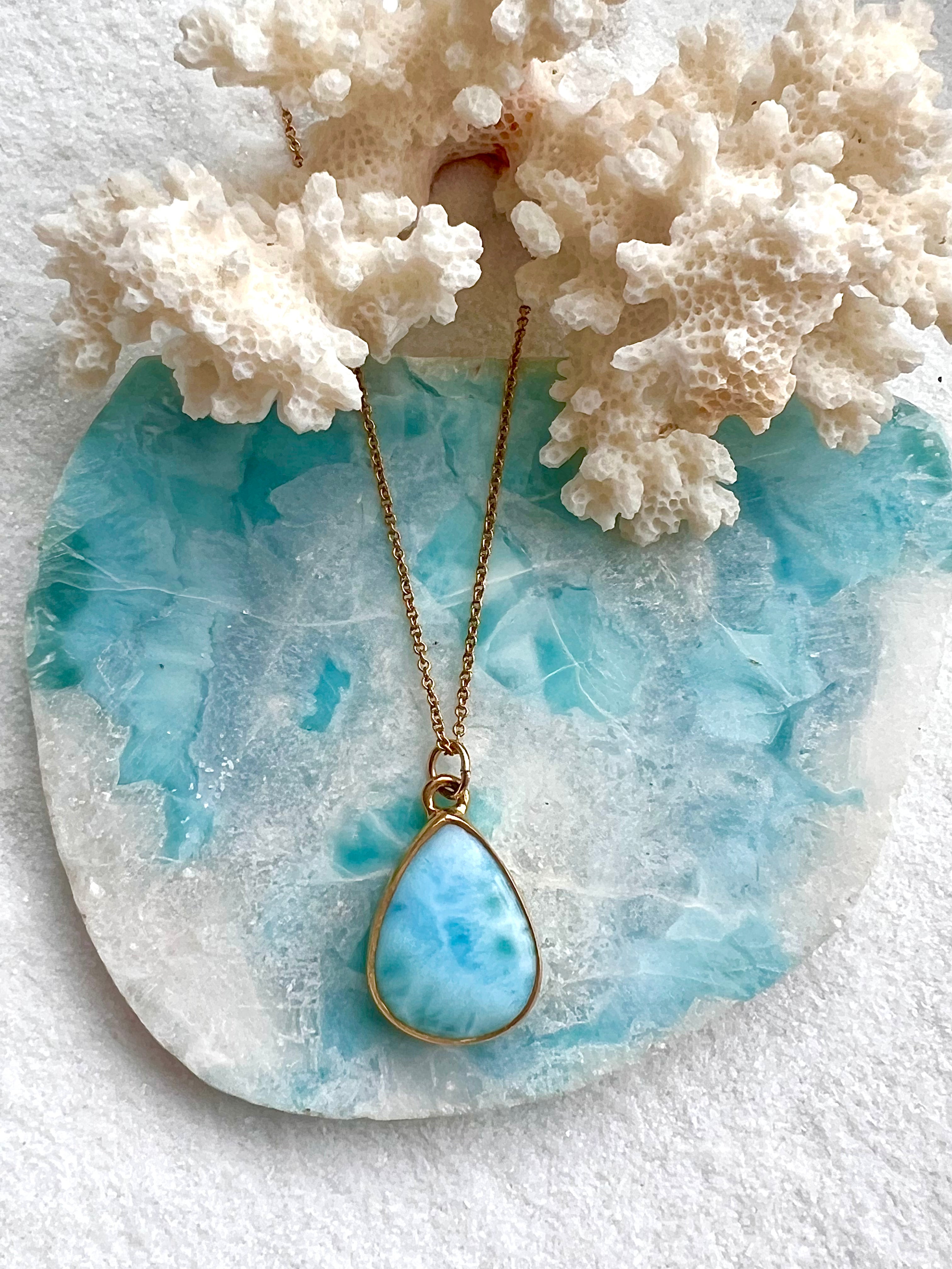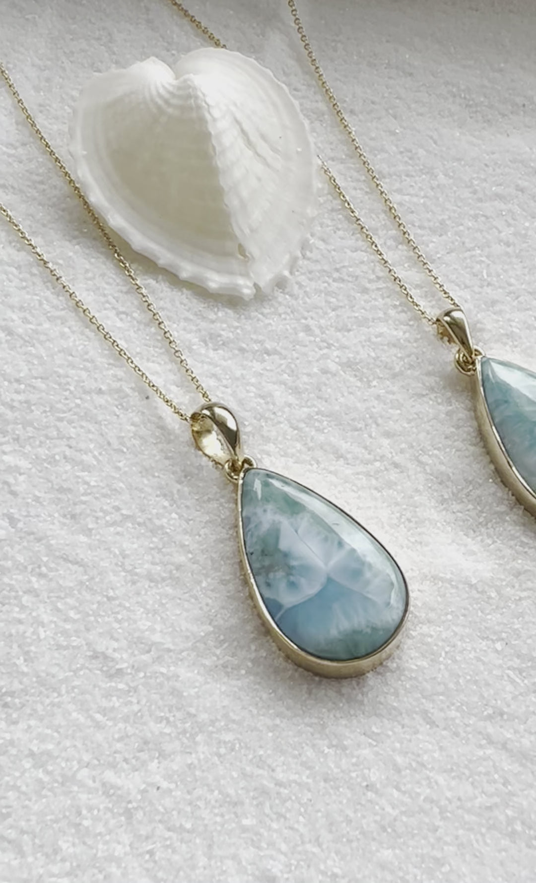This Larimar Goddess Necklace is a window looking into the beautiful prestine caribbean waters with the sunlight reflecting on the sandy ocean bottom.