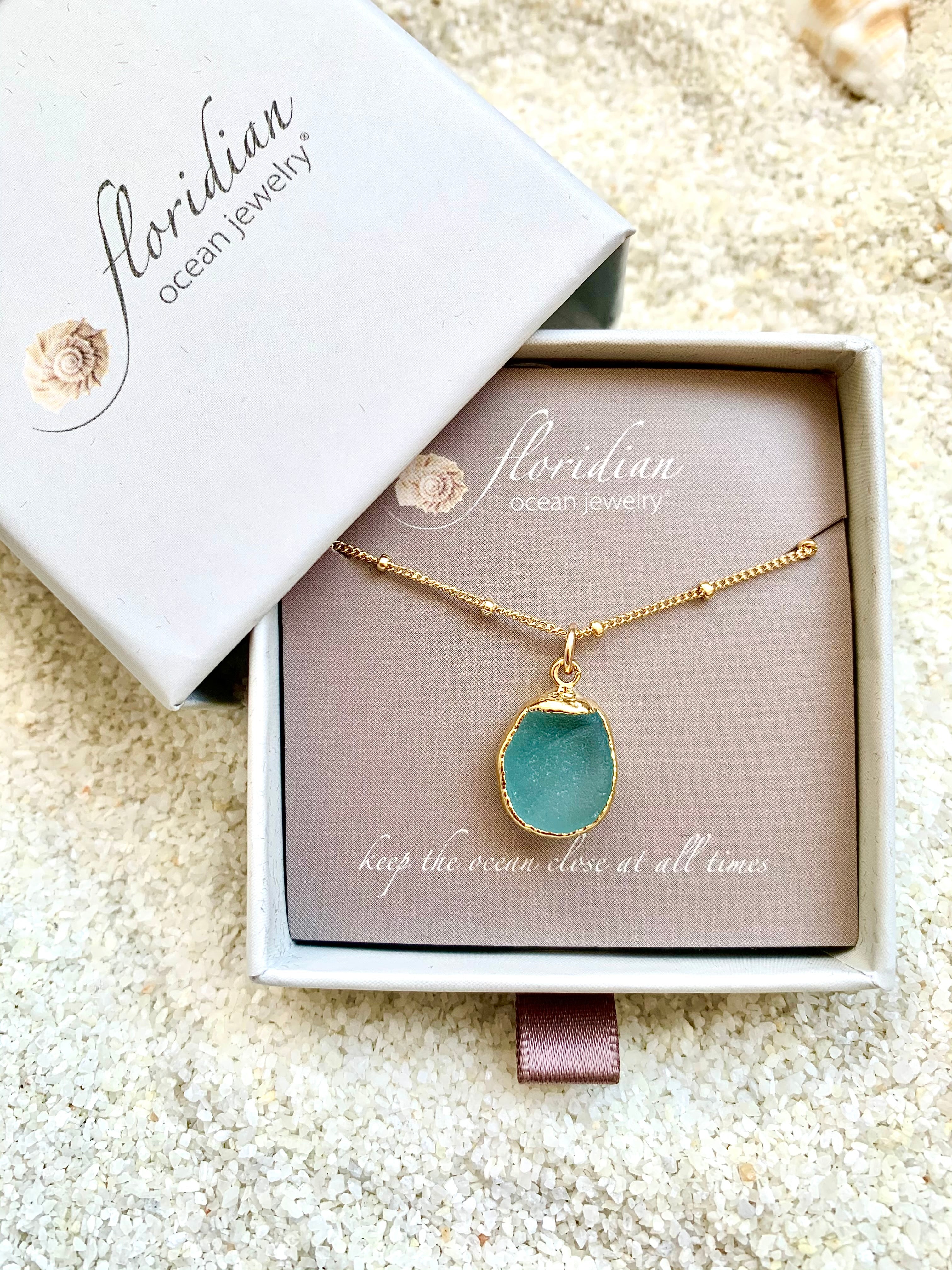 14k gold edging around the sea glass for long lasting non tarnishing beauty.