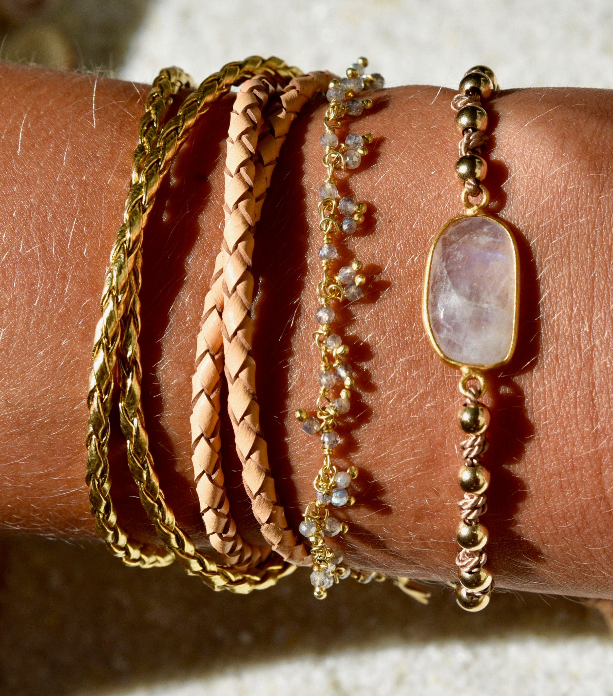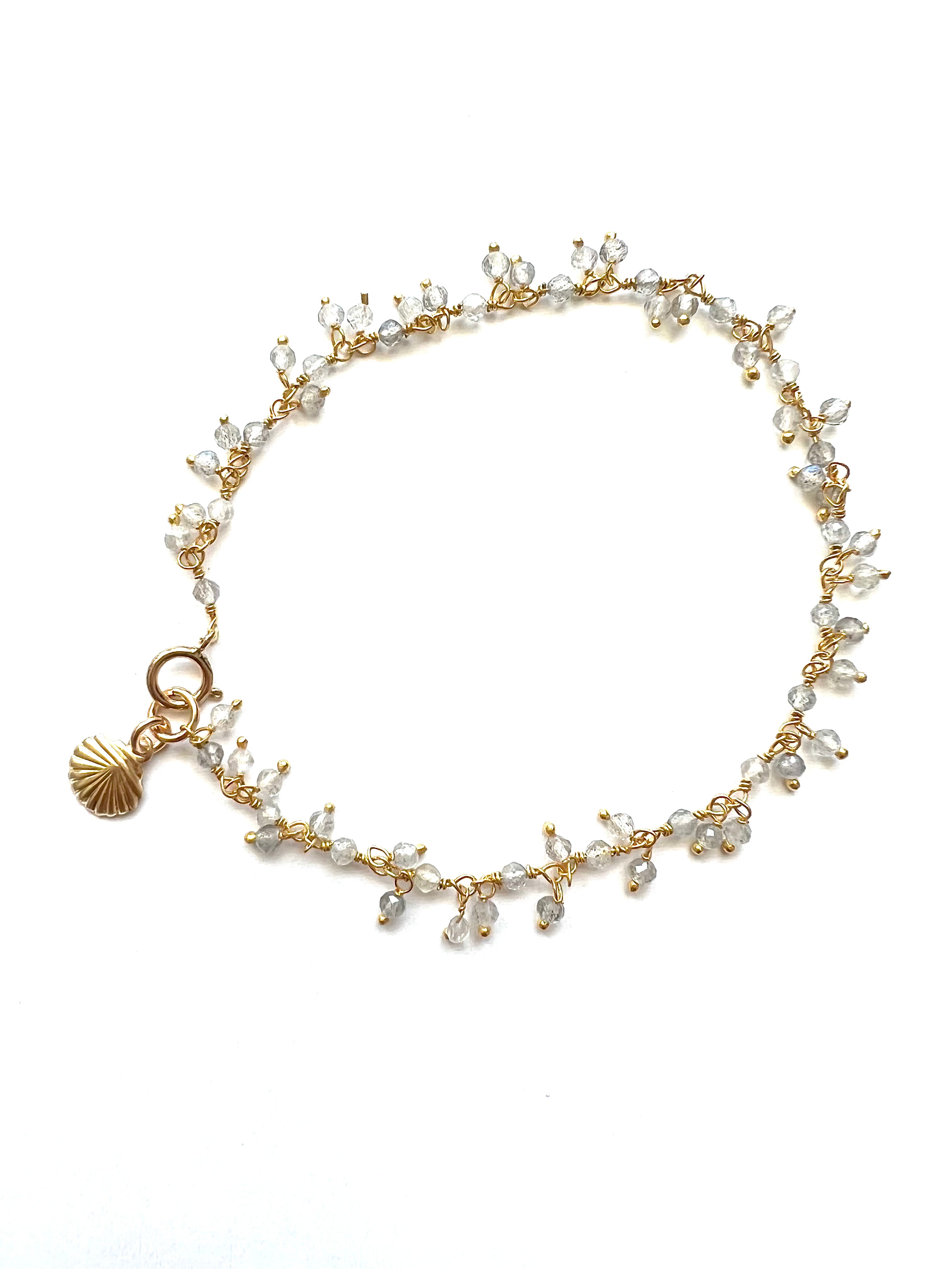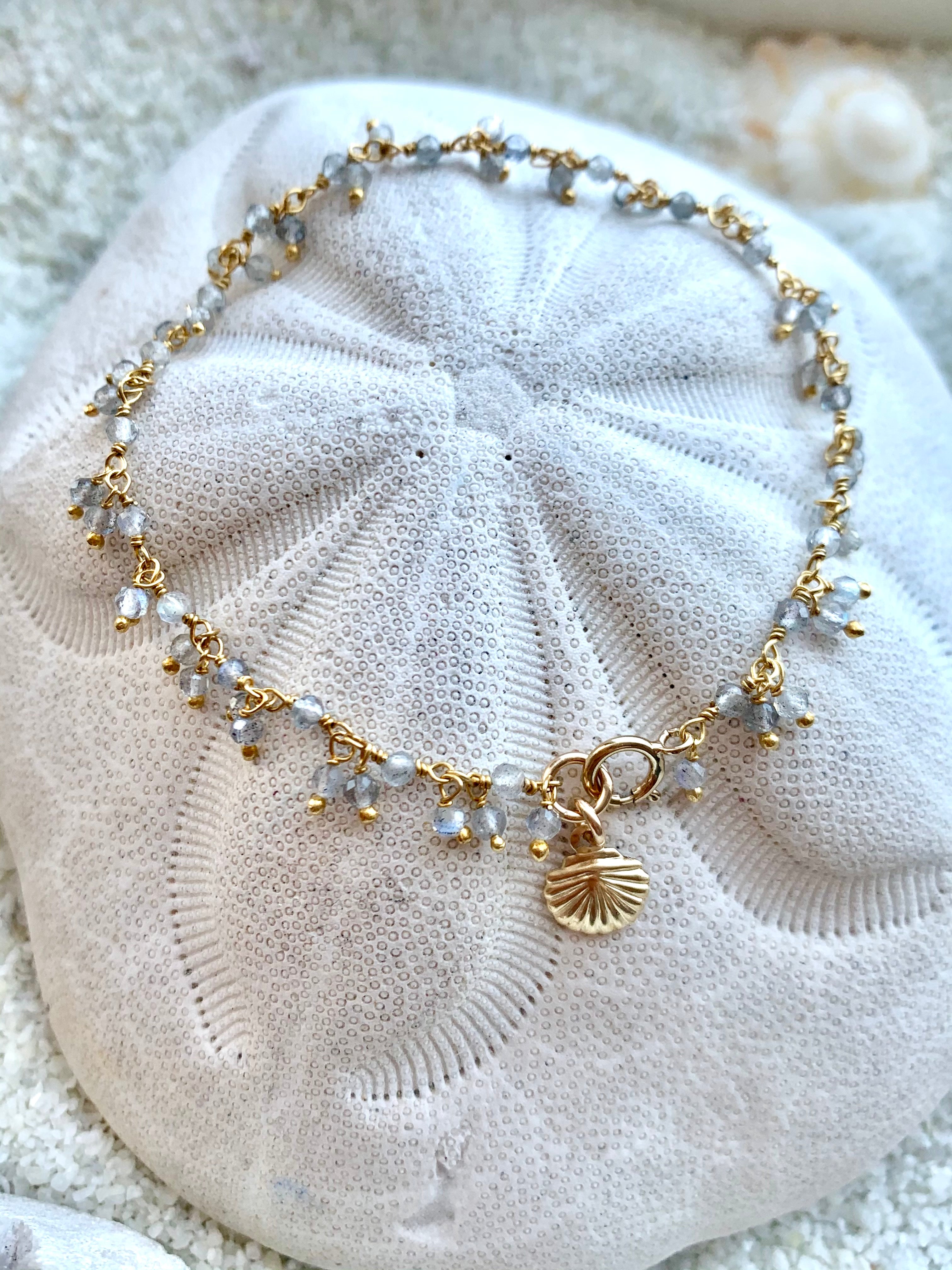 Sparkling Labradorite Beads on a 14k gold filled wire with a 14k gold filled sea shell charm.